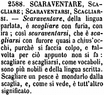 | Scaraventare, Scagliare; Scaraventarsi, Scagliarsi - Scaraventare, della lingua parlata, è scagliare con furia, con ira; così scaraventarsi, che è scagliarsi con furore quasi a chius'occhi, purchè si faccia colpo, e talvolta per ciò appunto non si fa: scagliare e scagliarsi, come vocaboli, sono più nobili e della lingua scritta. Scagliare un pesce è mondarlo dalla scaglia, e, come si vede, è tutt'altro significato. [immagine] |