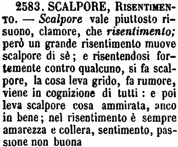 | Scalpore, Risentimento - Scalpore vale piuttosto risuono, clamore, che risentimento; però un grande risentimento muove scalpore di sè; e risentendosi fortemente contro qualcuno, si fa scalpore, la cosa leva grido, fa rumore, viene in cognizione di tutti: e poi leva scalpore cosa ammirata, anco in bene; nel risentimento è sempre amarezza e collera, sentimento, passione non buona [immagine] |