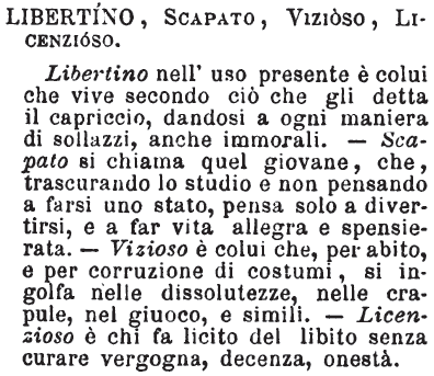 | Libertino, Scapato, Vizioso, Licenzioso - Libertino nell'uso presente è colui che vive secondo ciò che gli detta il capriccio, dandosi a ogni maniera di sollazzi, anche immorali. - Scapato si chiama quel giovane, che, trascurando lo studio e non pensando a farsi uno stato, pensa solo a divertirsi, e a far vita allegra e spensierata. - Vizioso è colui che, per abito, e per corruzione di costumi, si ingolfa nelle disslutezze, nelle crapule, nel giuoco, e simili. - Licenzioso è chi fa licito del libito senza curare vergogna, decenza, onestà. [immagine] |