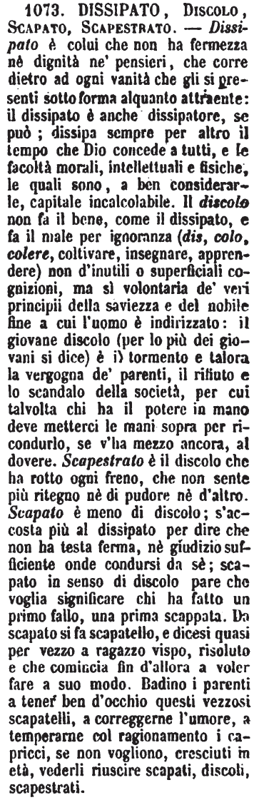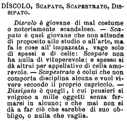 | Discolo, Scapato, Scapestrato, Dissipato - Discolo è giovane di mal costume o notoriamente scandaloso. - Scapato è quel giovane che non attende di proposito allo studio o all'arte, ma fa le cose all'impazzata, vago solo di spassi e di celie: Scapato non ha nulla di vituperevole; e spesso si dà altrui per appellativo di celia amorevole. - Scapestrato è colui che non comporta disciplina alcuna e vuol vivere secondo il proprio capriccio. - Dissipato è quegli, i cui pensieri si volgono a mille oggetti senza fermarsi in alcuno; e che mai non si dà a far ciò che sarebbe di suo obbligo, o nulla che vaglia. [immagine] |