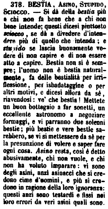 | Bestia, Asino, Stupido, Sciocco - Si dà della bestia più a chi non fa bene che a chi non bene intende; questi dicesi piuttosto sciocco, se dà a divedere d'intendere più di quello che intenda; e stupido se lascia buonamente vedere di non capire e di non essere atto a capire. Bestia non si è sempre; l'uomo non è bestia naturalmente, fa delle bestialità per irriflessione, per isbadataggine o per altri motivi, e dicesi allora da sè, riavendosi: ve' che bestia! Mettete un buon bottegaio a far sonetti, un eccellente astronomo a negoziare formaggi, e vi parranno due solenni bestie; più bestie e vere bestie sarebbero, se vi si mettessero da sè per la presunzione di volere e saper fare ogni cosa. Asino resta, così è detto abusivamente, chi non vuole, e chi non ha voluto imparare: vi sono degli asini, anzi asinacci che si credono cime d'uomini, e più si credono in ragione della loro ignoranza: questi anzi sono testardi e fissi nei loro errori da veri asini quali sono. [immagine] |