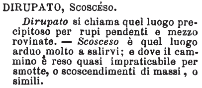 | Dirupato, Scosceso - Dirupato si chiama quel luogo precipitoso per rupi pendenti e mezzo rovinate. - Scosceso è quel luogo arduo molto a salirvi; e dove il cammino è reso quasi impraticabile per smotte, o scoscendimenti di massi, o simili. [immagine] |