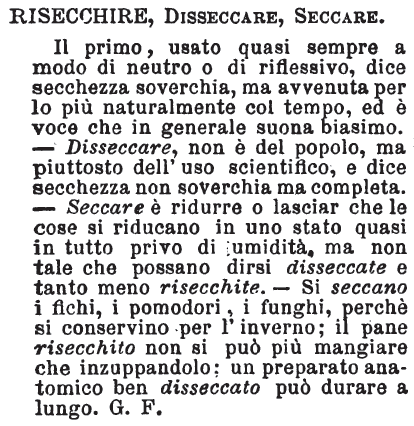 | Risecchire, Disseccare, Seccare - Il primo, usato quasi sempre a modo di neutro o di riflessivo, dice secchezza soverchia, ma avvenuta per lo più naturalmente col tempo, ed è voce che in generale suona biasimo. - Disseccare, non è del popolo, ma piuttosto dell'uso scientifico, e dice secchezza non soverchia ma completa. - Seccare è ridurre o lasciar che le cose si riducano in uno stato quasi in tutto privo di umidità, ma non tale che possano dirsi disseccate e tantomeno risecchite. - Si seccano i fichi, i pomodori, i funghi, perchè si conservino per l'inverno; il pane risecchito non si può più mangiare che inzuppandolo; un preparato anatomico ben disseccato può durare a lungo. G. F. [immagine] |
