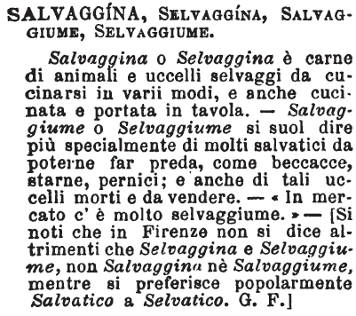 | Salvaggina, Selvaggina, Salvaggiume, Selvaggiume - Salvaggina o Selvaggina è carne di animali e uccelli selvaggi da cucinarsi in varii modi, e anche cucinata e portata in tavola. - Salvaggiume o Selvaggiume si suol dire più specialmente di molti salvatici da poterne far preda, come beccacce, starne, pernici; e anche di tali uccelli morti e da vendere. - « In mercato c'è molto selvaggiume.» -[Si noti che in Firenze non si dice altrimenti che Selvaggina e Selvaggiume, non Salvaggina nè Salvaggiume, mentre si preferisce popolarmente Salvatico a Selvatico. G. F.] [immagine] |