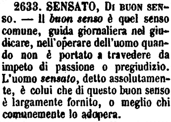 | Sensato, Di buon senso - Il buon senso è quel senso comune, guida giornaliera nel giudicare, nell'operare dell'uomo quando non è portato a travedere da impeto di passione o pregiudizio. L'uomo sensato, detto assolutamente, è colui che di questo buon senso è largamente fornito, o meglio chi comunemente lo adopera. [immagine] |
