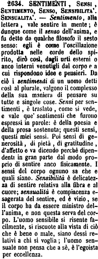 | Sentimenti, Sensi, Sentimento, Senso, Sensibilità, Sensualità - Sentimento, alla lettera, vale sentire in mente; è dunque come il senso dell'anima, e fu detto da qualche filosofo il sesto senso: egli è come l'oscillazione prodotta nelle corde dello spirito, dirò così, dagli urti esterni o anco interni venutigli dal corpo e a cui rispondono idee e pensieri. Da ciò i sentimenti di un uomo detti così al plurale, valgono il complesso della sua maniera di pensare su tutte e singole cose. Sensi per sentimenti, è traslato, come si vede, e vale que' sentimenti che furono espressi in parole: è della poesia e della prosa sostenuta; questi sensi, questi miei sensi. Poi sensi di generosità, di pietà, di gratitudine, d'affetto e va dicendo perchè dipendenti in gran parte dal modo proprio di sentire anco fisicamente. I sensi del corpo ognuno sa che e quali siano. Sensibilità è delicatezza di sentire relativa alla fibra e al cuore; sensualità è compiacenza esagerata del sentire, ed è vizio, se il corpo ha da essere ministro dell'anima, e non questa serva del corpo. L'uomo sensibile si risente facilmente, si riscuote alla vista di ciò che è bene o male, siano dessi relativi a chi si voglia; l'uomo sensuale non pensa che a sè, è l'egoista per eccellenza. [immagine] |