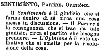 | Sentimento, Parere, Opinione - Il Sentimento è il giudizio che si forma dentro di sè circa una cosa messa in discussione. - Il Parere è la conseguenza che si trae da tale giudizio, circa al partito che bisogna prendere. - L'Opinione è il voto definitivo che si emette per la risoluzione della cosa. [immagine] |