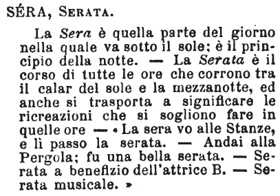 | Sera, Serata - La Sera è quella parte del giorno nella quale va sotto il sole; è il principio della notte. - La Serata è il corso di tutte le ore che corrono tra il calar del sole e la mezzanotte, ed anche si trasporta a significare le ricreazioni che si sogliono fare in quelle ore - «La sera vo alle Stanze, e lì passo la serata. - Andai alla Pergola; fu una bella serata. - Serata a benefizio dell'attrice B. - Serata musicale.» [immagine] |