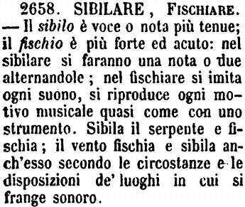 | Sibilare, Fischiare - Il sibilo è voce o nota più tenue; il fischio è più forte ed acuto: nel sibilare si faranno una nota o due alternandole; nel fischiare si imita ogni suono, si riproduce ogni motivo musicale quasi come con uno strumento. Sibila il serpente e fischia; il vento fischia e sibila anch'esso secondo le circostanze e le disposizioni de' luoghi in cui si frange sonoro. [immagine] |
