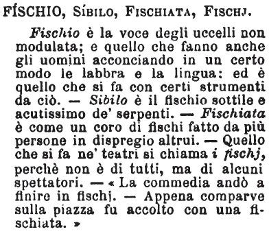 | Fischio, Sibilo, Fischiata, Fischj - Fischio è la voce degli uccelli non modulata; e quello che fanno anche gli uomini acconciando in un certo modo le labbra e la lingua: ed è quello che si fa con certi strumenti da ciò. - Sibilo è il fischio sottile e acutissimo de' serpenti. - Fischiata è come un coro di fischi fatto da più persone in dispregio altrui. - Quello che si fa ne' teatri si chiama i fischj, perchè non è di tutti, ma di alcuni spettatori. - «La commedia andò a finire in fischj. - Appena comparve sulla piazza fu accolto con una fischiata.» [immagine] |