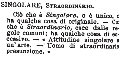 | Singolare, Straordinario - Ciò che è Singolare, o è unico, o ha qualche cosa di originale. Cio che è Straordinario, esce dalle regole comuni; ha qualche cosa di eccessivo. « Attitudine singolare a un'arte. Uomo di straordinaria presunzione. » [immagine] |