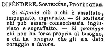 | Difendere, Sostenere, Proteggere - Si difende ciò o chi è assaltato, impugnato, ingiuriato. - Si sostiene chi può essere comecchessia ingiuriato e sopraffatto. - Si protegge chi non ha forza propria al bisogno, e chi ha bisogno che gli sia dato coraggio e favore. [immagine] |