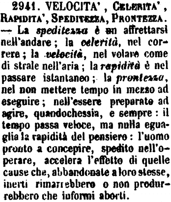 | Velocità, Celerità, Rapidità, Speditezza, Prontezza - La speditezza è un affrettarsi nell'andare; la celerità, nel correre; la velocità, nel volare come di strale nell'aria; la rapidità è nel passare istantaneo; la prontezza, nel non mettere tempo in mezzo ad eseguire; nell'essere preparato ad agire, quandochessia, e sempre: il tempo passa veloce, ma nulla eguaglia la rapidità del pensiero: l'uomo pronto a concepire, spedito nell'operare, accelera l'effetto di quelle cause che, abbandonate a loro stesse, inerti rimarrebbero o non produrrebbero che informi aborti. [immagine] |