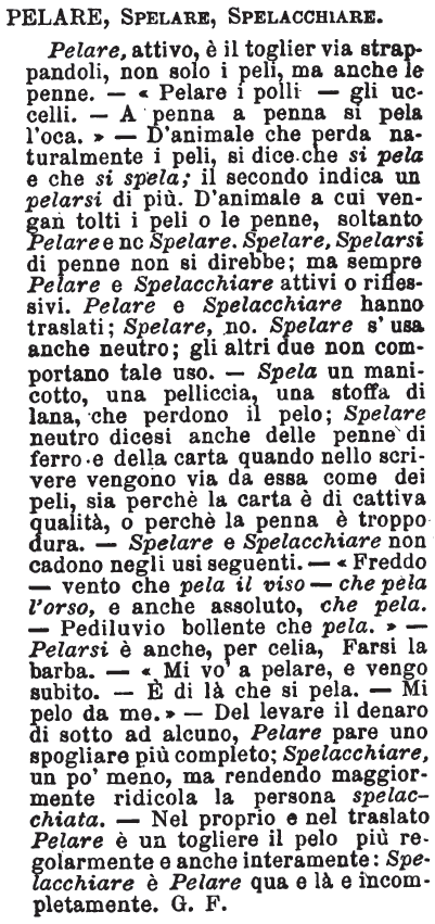 | Pelare, Spelare, Spelacchiare - Pelare, attivo, è il toglier via strappandoli, non solo i peli, ma anche le penne. - «Pelare i polli - gli uccelli. - A penna a penna si pela l'oca.» - D'animale che perda naturalmente i peli, si dice che si pela e che si spela; il secondo indica un pelarsi di più. D'animale a cui vengan tolti i peli o le penne, soltanto Pelare e no Spelare. Spelare, Spelarsi di penne non si direbbe; ma sempre Pelare e Spelacchiare attivi o riflessivi. Pelare e Spelacchiare hanno traslati; Spelare, no. Spelare s'usa anche neutro; gli altri due non comportano tale uso. - Spela un manicotto, una pelliccia, una stoffa di lana, che perdono il pelo; Spelare neutro dicesi anche delle penne di ferro e della carta quando nello scrivere vengono via da essa come dei peli, sia perché la carta è di cattiva qualità, o perché la penna è troppo dura. - Spelare e Spelacchiare non cadono negli usi seguenti. - «Freddo - vento che pela il viso - che pela l'orso, e anche assoluto, che pela. - Pediluvio bollente che pela.» - Pelarsi è anche, per celia, Farsi la barba. - «Mi vo' a pelare, e vengo subito. - È di là che si pela. - Mi pelo da me.» - Del levare il denaro di sotto ad alcuno, Pelare pare uno spogliare più completo; Spelacchiare, un po' meno, ma rendendo maggiormente ridicola la persona spelacchiata. - Nel proprio e nel traslato Pelare è un togliere il pelo più regolarmente e anche interamente: Spelacchiare è Pelare qua e là e incompletamente. G. F. [immagine] |
