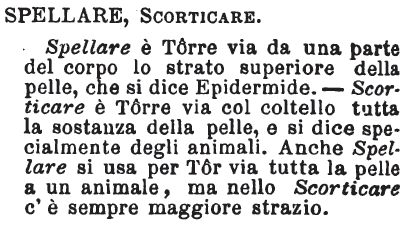| Spellare, Scorticare - Spellare è Tôrre via da una parte del corpo lo strato superiore della pelle, che si dice Epidermide. - Scorticare è Tôrre via col coltello tutta la sostanza della pelle, e si dice specialmente degli animali. Anche Spellare si usa per Tôr via tutta la pelle a un animale, ma nello Scorticare c'è sempre maggiore strazio. [immagine] |