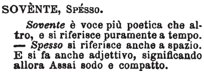 Sovente, Spesso - Sovente è voce più poetica che altro, e si riferisce puramente a tempo. - Spesso si riferisce anche a spazio. E si fa anche adjettivo, significando allora Assai sodo e compatto. [immagine]