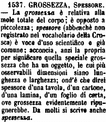 | Grossezza, Spessore - La grossezza è relativa alla mole totale del corpo; è opposto a piccolezza; spessore (abbenchè non registrato nel vocabolario della Crusca) è voce d'uso scientifico e già comune; acconcia, anzi la propria per significare quella speciale grossezza che ha un oggetto, le cui più osservabili dimensioni siano lunghezza e larghezza; ond'è che direi spessore d'una tavola, d'un cartone, d'una lamina, d'un foglio di carta, ove grossezza evidentemente ripugnerebbe. Da molti si scrive anche spessezza. [immagine] |
