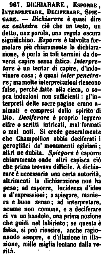 | Dichiarare, Spiegare, Esporre, Interpretare - Dichiarare è Render chiaro ciò che è oscuro, per via di raziocinio. - Spiegare è sciogliere, per via di ammaestramento e secondo le regole dell'arte, ogni vincolo e ogni involtura, che si oppone alla intelligenza o di una frase o d'un fatto non compreso. - Esporre è il dimostrare secondo le regole della scienza o della oratoria, tutto ciò che vi ha di bello, di pregevole in un'opera o componimento. - Interpretare è dimostrare e far apprezzare, per via della ermeneutica, o arte interpretatoria, ogni bellezza, ogni senso nascosto, di un'opera o scientifica o poetica o filosofica. [immagine] |