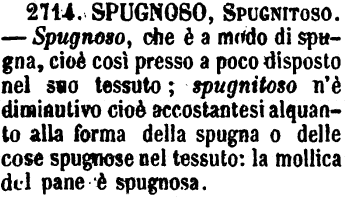 | Spugnoso, Spugnitoso - Spugnoso, che è a modo di spugna, cioè così presso a poco disposto nel suo tessuto; spugnitoso n'è diminutivo cioè accostantesi alquanto alla forma della spugna o delle cose spugnose nel tessuto: la mollica del pane è spugnosa. [immagine] |