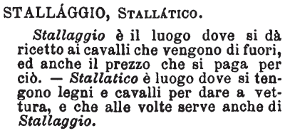 | Stallaggio, Stallatico - Stallaggio è il luogo dove si dà ricetto ai cavalli che vengono di fuori, ed anche il prezzo che si paga per ciò. - Stallatico è luogo dove si tengono legni e cavalli per dare a vettura, e che alle volte serve anche di Stallaggio. [immagine] |