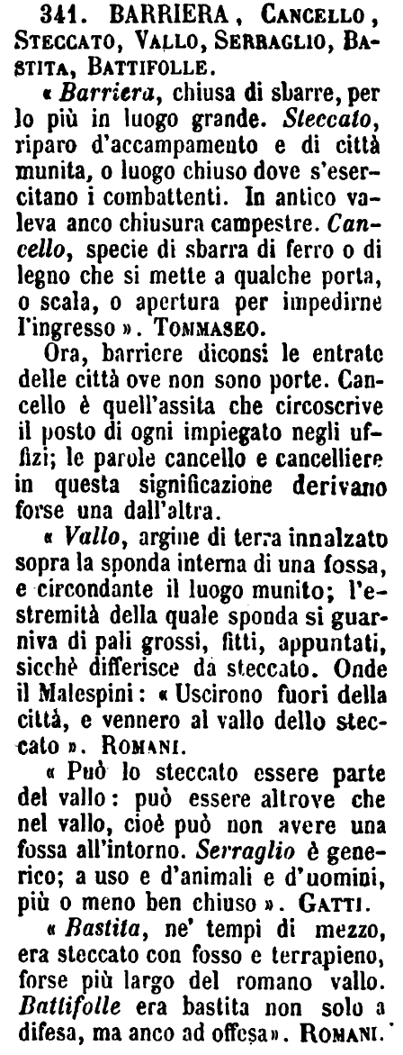 | Barriera, Cancello, Steccato, Vallo, Serbaglio, Bastita, Battifolle - «Barriera, chiusa di sbarre, per lo più in luogo grande. Steccato, riparo d'accampamento e di città munita, o luogo chiuso dove s'esercitano i combattenti. In antico valeva anco chiusura campestre. Cancello, specie di sbarra di ferro o di legno che si mette a qualche porta, o scala, o apertura per impedirne l'ingresso». Tommaseo.