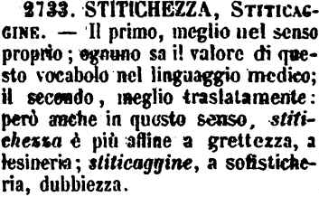 | Stitichezza, Stiticaggine - Il primo, meglio nel senso proprio; ognuno sa il valore di questo vocabolo nel linguaggio medico; il secondo, meglio traslatamente: però anche in questo senso, stitichezza è più affine a grettezza, a lesineria; stiticaggine, a sofisticheria, dubbiezza. [immagine] |