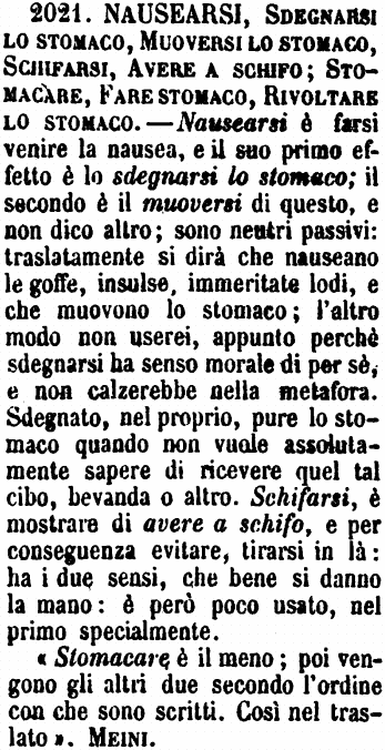 Nausearsi, Sdegnarsi lo stomaco, Muoversi lo stomaco, Schifarsi, Avere a schifo; Stomacare, Fare stomaco, Rivoltare lo stomaco - Nausearsi è farsi venire la nausea, e il suo primo effetto è lo sdegnarsi lo stomaco; il secondo è il muoversi di questo, e non dico altro; sono neutri passivi: traslatamente si dirà che nauseano le goffe, insulse, immeritate lodi, e che muovono lo stomaco; l'altro modo non userei, appunto perchè sdegnarsi ha senso morale di per sè, e non calzerebbe nella metafora. Sdegnato, nel proprio, pure lo stomaco quando non vuole assolutamente sapere di ricevere quel tal cibo, bevanda o altro. Schifarsi, è mostrare di avere a schifo, e per conseguenza evitare, tirarsi in là: ha i due sensi, che bene si danno la mano: è però poco usato, nel primo specialmente.