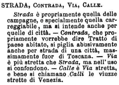 | Strada, Contrada, Via, Calle - Strada è propriamente quella delle campagne, e specialmente quella carreggiabile, ma si intende anche per quelle di città. - Contrada, che propriamente vorrebbe dire Tratto di paese abitato, si piglia abusivamente anche per strada di una città, massimamente fuor di Toscana. - Via è più stretta che Strada, ma nell'uso si confondono. - Calle è Via stretta, e bene si chiamano Calli le viuzze strette di Venezia. [immagine] |