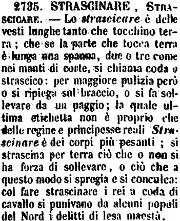 | Strascinare, Strascicare - Lo Strascicare è delle vesti lunghe tanto che tocchino terra; che se la parte che tocca terra è lunga una spanna, due o tre, come nei manti di Corte, si chiama Coda o Strascico; per maggiore pulizia però o si ripiega sul braccio, o si fa sollevare da un paggio, la quale ultima etichetta non è propria che delle regine e principesse reali. - Strascinare è dei corpi più pesanti. Si strascina per terra ciò che o non si ha forza di sollevare, o ciò che a questo modo si spregia e si conculca. Col fare strascinare i rei a coda di cavallo, si punivano da alcuni popoli del Nord i delitti di lesa maestà. (Zecchini). [immagine] |