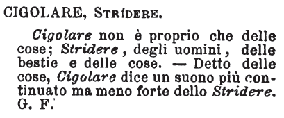 | Cigolare, Stridere - Cigolare non è proprio che delle cose; Stridere, degli uomini, delle bestie e delle cose. - Detto delle cose, Cigolare dice un suono più continuato ma meno forte dello Stridere. G. F. [immagine] |