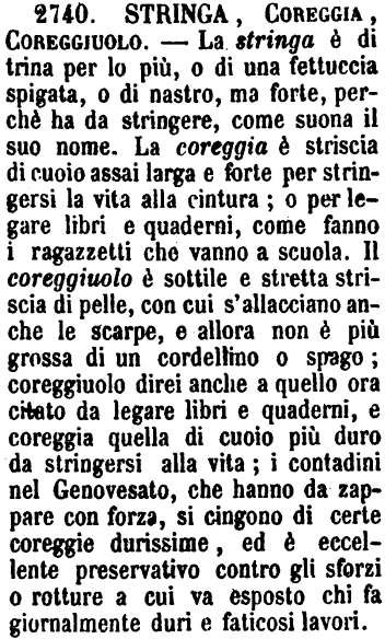 | Stringa, Coreggia, Coreggiuolo - La stringa è di trina per lo più, o di una fettuccia spigata, o di nastro, ma forte, perchè ha da stringere, come suona il suo nome. La coreggia è striscia di cuoio assai larga e forte per stringersi la vita alla cintura; o per legare libri e quaderni, come fanno i ragazzetti che vanno a scuola. Il coreggiuolo è sottile e stretta striscia di pelle, con cui s'allacciano anche le scarpe, e allora non è più grossa di un cordellino o spago; coreggiuolo direi anche a quello ora citato da legare libri e quaderni, e coreggia quella di cuoio più duro da stringersi alla vita; i contadini nel Genovesato, che hanno da zappare con forza, si cingono di certe coreggie durissime, ed è eccellente preservativo contro gli sforzi o rotture a cui va esposto chi fa giornalmente duri e faticosi lavori. [immagine] |