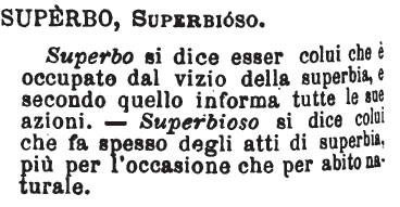 Superbo, Superbioso - Superbo si dice esser colui che è occupato dal vizio della superbia, e secondo quello informa tutte le sue azioni. - Superbioso si dice colui che fa spesso degli atti di superbia, più per l'occasione che per abito naturale. [immagine]