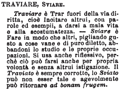 | Traviare, Sviare - Traviare è Trar fuori della via diritta, cioè Incitare altrui, con parole ed esempii, a darsi a mala vita e alla scostumatezza. - Sviare è Fare in modo che altri, pigliando gusto a cose vane e di puro diletto, abbandoni lo studio e le proprie occupazioni. Si usa anche riflessivo, perchè ciò può farsi anche per propria volontà e senza altrui istigazione. Il Traviato è sempre corrotto, lo Sviato può non esser tale e agevolmente può ritornare ad bonam frugem. [immagine] |