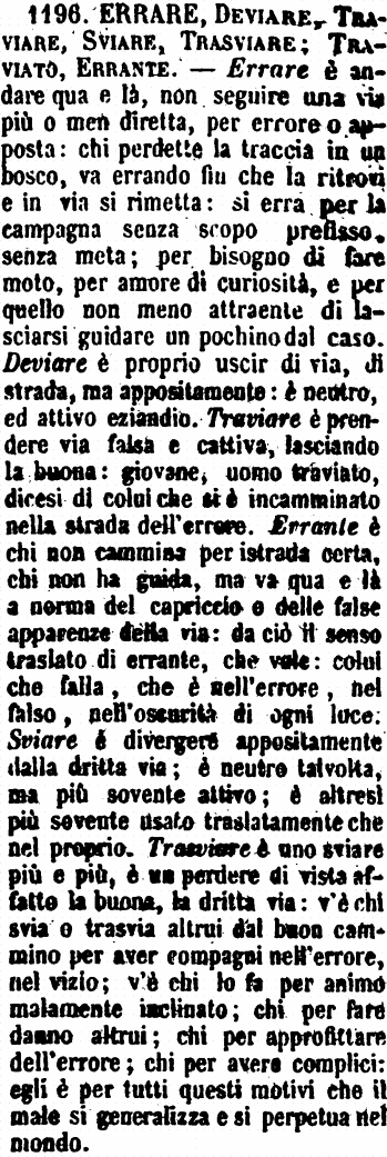 | Errare, Deviare, Traviare, Sviare, Trasviare; Traviato, Errante - Errare è andare qua e là, non seguire una via più o men diretta, per errore o apposta: chi perdette la traccia in un bosco, va errando fin che la ritrovi e in via si rimetta: si erra per la campagna senza scopo prefisso, senza meta; per bisogno di fare moto, per amore di curiosità, e per quello non meno attraente di lasciarsi guidare un pochino dal caso. Deviare è proprio uscir di via, di strada, ma appositamente: è neutro, ed attivo eziandio. Traviare è prendere via falsa e cattiva, lasciando la buona: giovane, uomo traviato, dicesi di colui che si è incamminato nella strada dell'errore. Errante è chi non cammina per istrada certa, chi non ha guida, ma va qua e là a norma del capriccio e delle false apparenze dalla via: da ciò il senso traslato di errante, che vale: colui che falla, che è nell'errore, nel falso, nell'oscurità di ogni luce. Sviare è divergere appositamente dalla dritta via; è neutro talvolta, ma più sovente attivo; è altresì più sovente usato traslatamente che nel proprio. Trasviare è uno sviare più e più, è un perdere di vista affatto la buona, la dritta via: v'è chi svia o trasvia altrui dal buon cammino per aver compagni nell'errore, nel vizio; v'è chi lo fa per animo malamente inclinato; chi per fare danno altrui; chi per approfittare dell'errore; chi per avere complici: egli è per tutti questi motivi che il male si generalizza e si perpetua nel mondo. [immagine] |