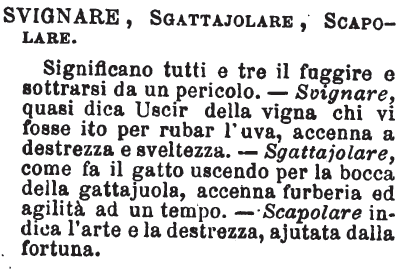 | Svignare, Sgattajolare, Scapolare - Significano tutti e tre il fuggire e sottrarsi da un pericolo. - Svignare, quasi dica Uscir della vigna chi vi fosse ito per rubar l'uva, accenna a destrezza e sveltezza. - Sgattajolare, come fa il gatto uscendo per la bocca della gattajuola, accenna furberia ed agilità ad un tempo. - Scapolare indica l'arte e la destrezza, ajutata dalla fortuna. [immagine] |