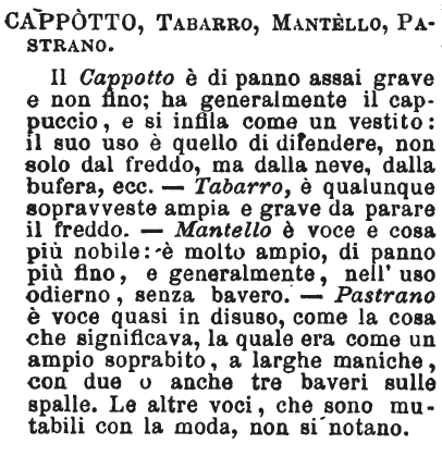 | Gabbano, Gabbanella, Tabarro, Cappotto, Cappotta, Pastrano, Ferraiuolo, Mantello, Pastranella, Palandrana, Ferraiolino - «Il gabbano è con maniche, e più grosso che fine: gabbano è quello del contadino; gabbano, anche quello del signore, ma non mai leggiero. Gabbanella, sopraveste quasi a forma di gabbano, men grossa e men lunga. Così chiamasi anco quella che portano e assistenti e convalescenti all'ospedale di Firenze. Non ha bavero, e non differisce da un grossolano soprabito che nella maggior lunghezza e larghezza. Il tabarro è più d'uso nella città, d'ordinario più fine. Così si chiamano quelli che i nostri avi, quarant'anni fa, usavano, di scarlatto, e che noi (imitatori anche non volendo) usavamo d'altro colore testè, ma della medesima forma a un dipresso. Il tabarro è senza maniche, con bavero o senza. Il cappotto è più forte, suol essere foderato: s'usa in città e da' marinari, barcaiuoli, navicellai, galeotti; quel de' marinari ha un cappuccio da coprire la testa. Col cappotto, i guardiani di cavalli e i cacciatori si difendono dalla pioggia e dal freddo. La fodera, d'ordinario, è di leggero ma dozzinale tessuto di lana, comunemente detto baiettone. Cappotta dicevasi quella poco fa usata dalle donne, che ha la forma del tabarro a un dipresso, ma d'altro colore e d'altro drappo. Il pastrano è gabbano co' baveri, uno o più, or più or men lunghi, con maniche; e non stretto alla vita come il gabbano e il cappotto. La pastranella è un po' più leggiera; o è pastrano di persone di servizio, come staffieri o cocchieri, con qualche segno di livrea. Mantello è voce d'uso antico e moderno. Mantello è quello de' preti. Palandrana è gabbano o cappotto largo, da casa, da strapazzo; e anche ogni altro lungo e dozzinale vestito che non assetti bene. Con questo nome (nome di disprezzo) si chiamano a Firenze al monte di pietà i ferraiuoli e i pastrani che si mettono in pegno. Il ferraiuolo è senza maniche; o mezzo o intero. L'intero cinge la persona a modo di cerchio. Quello che i preti portano la state è ferraiolino». Tommaseo.