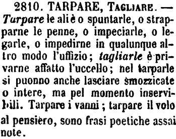 | Tarpare, Tagliare - Tarpare le ali è o spuntarle, o strapparne le penne, o impeciarle, o legarle, o impedirne in qualunque altro modo l'uffizio; tagliarle è privarne affatto l'uccello; nel tarparle si puonno anche lasciare smozzicate o intere, ma pel momento inservibili. Tarpare i vanni; tarpare il volo al pensiero, sono frasi poetiche assai note. [immagine] |