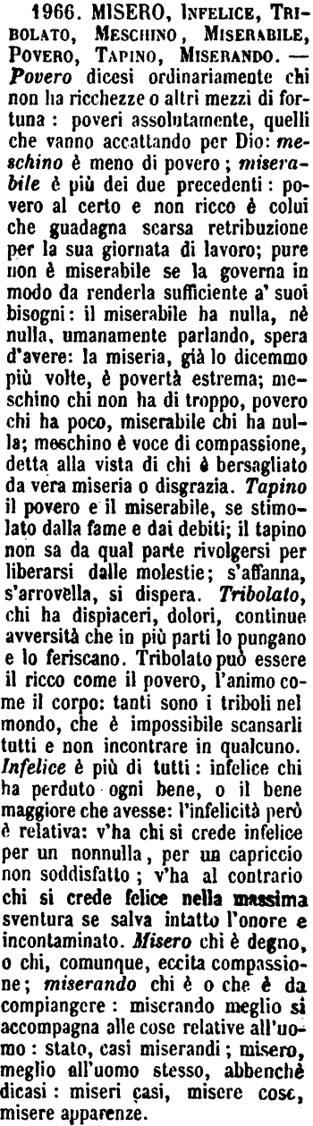 | Misero, Infelice, Tribolato, Meschino, Miserabile, Povero, Tapino, Miserando - Povero dicesi ordinariamente chi non ha ricchezze o altri mezzi di fortuna: poveri assolutamente, quelli che vanno accattando per Dio: meschino è meno di povero; miserabile è più dei due precedenti: povero al certo e non ricco è colui che guadagna scarsa retribuzione per la sua giornata di lavoro; pure non è miserabile se la governa in modo da renderla sufficiente a' suoi bisogni: il miserabile ha nulla, nè nulla, umanamente parlando, spera d'avere: la miseria, già lo dicemmo più volte, è povertà estrema; meschino chi non ha di troppo, povero chi ha poco, miserabile chi ha nulla; meschino è voce di compassione, detta alla vista di chi è bersagliato da vera miseria o disgrazia. Tapino il povero e il miserabile, se stimolato dalla fame e dai debiti; il tapino non sa da qual parte rivolgersi per liberarsi dalle molestie; s'affanna, s'arrovella, si dispera. Tribolato, chi ha dispiaceri, dolori, continue avversità che in più parti lo pungano e lo feriscano. Tribolato può essere il ricco come il povero, l'animo come il corpo: tanti sono i triboli nel mondo, che è impossibile scansarli tutti e non incontrare in qualcuno. Infelice è più di tutti: infelice chi ha perduto ogni bene, o il bene maggiore che avesse: l'infelicità però è relativa: v'ha chi si crede infelice per un nonnulla, per un capriccio non soddisfatto; v'ha al contrario chi si crede felice nella massima sventura se salva intatto l'onore e incontaminato. Misero chi è degno, o chi, comunque, eccita compassione; miserando chi è o che è da compiangere: miserando meglio si accompagna alle cose relative all'uomo: stato, casi miserandi; misero, meglio all'uomo stesso, abbenchè dicasi: miseri casi, misere cose, misere apparenze. [immagine] |