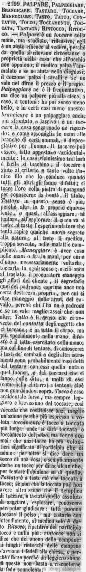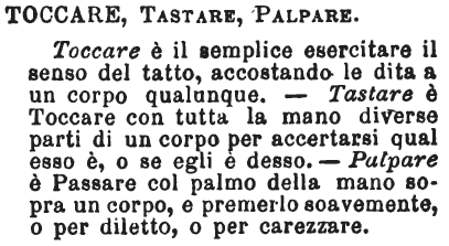 | Toccare, Tastare, Palpare - Toccare è semplice esercitare il senso del tatto, accostando le dita a un corpo qualunque. - Tastare è Toccare con tutta la mano diverse parti di un corpo per accertarsi qual esso è, o se egli è desso. - Palpare è Passare col palmo della mano sopra un corpo, e premerlo soavemente, o per diletto, o per carezzare. [immagine] |