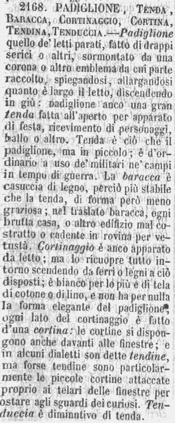 | Padiglione, Tenda, Baracca, Cortinaggio, Cortina, Tendina, Tenduccia - Padiglione quello de' letti parati, fatto di drappi serici o altri, sormontato da una corona o altro emblema da cui parte raccolto, spiegandosi, allargandosi quanto è largo il letto, discendendo in giù: padiglione anco una gran tenda fatta all'aperto per apparato di festa, ricevimento di personaggi, ballo o altro. Tenda è ciò che il padiglione, ma in piccolo; è d'ordinario a uso de' militari ne' campi in tempo di guerra. La baracca è casuccia di legno, perciò più stabile che la tenda, di forma però meno graziosa; nel traslato baracca, ogni brutta casa, o altro edifizio mal costrutto o cadente in rovina per vetustà. Cortinaggio è anco apparato da letto; ma lo ricuopre tutto intorno scendendo da ferri o legni a ciò disposti; è bianco per lo più e di tela di cotone o di lino, e non ha per nulla la forma elegante del padiglione, ogni lato del cortinaggio è fatto d'una cortina: le cortine si dispongono anche davanti alle finestre; e in alcuni dialetti son dette tendine, ma forse tendine sono particolarmente le piccole cortine attaccate proprio ai telari delle finestre per ostare agli sguardi dei curiosi. Tenduccia è diminutivo di tenda. [immagine] |