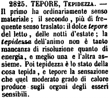 | Tepore, Tepidezza - Il primo ha ordinariamente senso materiale; il secondo, più di frequente senso traslato: il dolce tepore del letto, delle notti d'estate; la tepidezza dell'animo non è tanto mancanza di risoluzione quanto di energia, e meglio una e l'altra assieme. Poi tepidezza è lo stato della cosa tepida, e tepore la sensazione che quel moderato grado di calore produce sugli organi degli esseri sensibili. [immagine] |