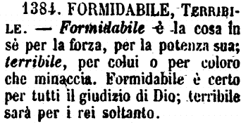 | Formidabile, Terribile - Formidabile è la cosa in sè per la forza, per la potenza sua; terribile, per colui o per coloro che minaccia. Formidabile è certo per tutti il giudizio di Dio; terribile sarà per i rei soltanto. [immagine] |