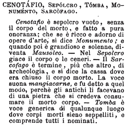 | Cenotafio, Sepolcro, Tomba, Monumento, Sarcofago - Cenotafio è sepolcro vuoto, senza il corpo del morto, e fatto a pura onoranza; che se è ricco e adorno di opere d'arte, si dice Monumento; e quando poi è grandioso e solenne, diventa Mausoleo. - Nel Sepolcro giace il corpo o le ceneri. - Il Sarcofago è termine, più che altro, di archeologia, e si dice la cassa dove era chiuso il corpo morto. La voce suona mangiacarne, e fu detto a quel modo, perchè gli antichi li facevano di una pietra che si credeva consumare il morto corpo. - Tomba è voce generica di qualunque luogo dove corpi morti sieno seppelliti, e comprende tutti i nominati. [immagine] |