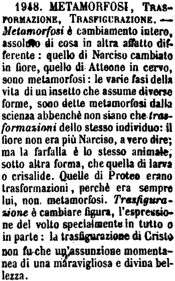 Metamorfosi, Trasformazione, Trasfigurazione - Metamorfosi è cambiamento intero, assoluto di cosa in altra affatto differente: quello di Narciso cambiato in fiore, quello di Atteone in cervo, sono metamorfosi: le varie fasi della vita di un insetto che assume diverse forme, sono dette metamorfosi dalla scienza abbenchè non siano che trasformazioni dello stesso individuo: il fiore non era più Narciso, a vero dire; ma la farfalla è lo stesso animale, sotto altra forma, che quella di larva o crisalide. Quelle di Proteo erano trasformazioni, perchè era sempre lui, non metamorfosi. Trasfigurazione è cambiar figura, l'espressione del volto specialmente in tutto o in parte: la trasfigurazione di Cristo non fu che un'assunzione momentanea di una maravigliosa e divina bellezza. [immagine]