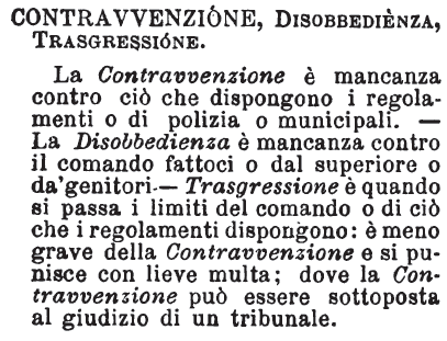 | Contravvenzione, Disobbedienza, Trasgressione - La Contravvenzione è mancanza contro ciò che dispongono i regolamenti o di polizia o municipali. - La Disobbedienza è mancanza contro il comando fattoci o dal superiore o da' genitori - Trasgressione è quando si passa i limiti del comando o di ciò che i regolamenti dispongono: è meno grave della Contravvenzione e si punisce con lieve multa; dove la Contravvenzione può essere sottoposta al giudizio di un tribunale. [immagine] |
