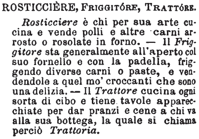 | Rosticciere, Friggitore, Trattore - Rosticciere è chi per sua arte cucina e vende polli e altre carni arrosto o rosolate in forno. - Il Friggitore sta generalmente all'aperto col suo fornello e con la padella, friggendo diverse carni o paste, e vendendole a quel mo' croccanti che sono una delizia. - Il Trattore cucina ogni sorta di cibo e tiene tavole apparecchiate per dar pranzi e cene a chi va alla sua bottega, la quale si chiama perciò Trattoria. [immagine] |