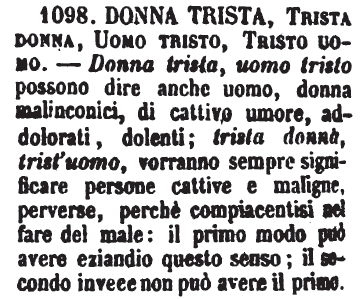 | Donna trista, Trista donna, Uomo tristo, Tristo uomo - Donna trista, uomo tristo possono dire anche uomo, donna malinconici, di cattivo umore, addolorati, dolenti; trista donna, trist'uomo, vorranno sempre significare persone cattive e maligne, perverse, perchè compiacentisi nel fare del male: il primo modo può avere eziandio questo senso; il secondo invece non può avere il primo. [immagine] |
