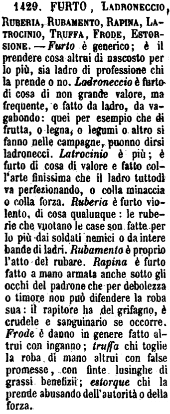 | Furto, Ladroneccio, Ruberia, Rubamento, Rapina, Latrocinio, Truffa, Frode, Estorsione - Furto è generico; è il prendere cosa altrui di nascosto per lo più, sia ladro di professione chi la prende o no. Ladroneccio è furto di cosa di non grande valore, ma frequente, e fatto da ladro, da vagabondo: quei per esempio che di frutta, o legna, o legumi o altro si fanno nelle campagne, puonno dirsi ladronecci. Latrocinio è più; è furto di cosa di valore e fatto coll'arte finissima che il ladro tuttodì va perfezionando, o colla minaccia o colla forza. Ruberia è furto violento, di cosa qualunque: le ruberie che vuotano le case son fatte per lo più dai soldati nemici o da intere bande di ladri. Rubamento è proprio l'atto del rubare. Rapina è furto fatto a mano armata anche sotto gli occhi del padrone che per debolezza o timore non può difendere la roba sua: il rapitore ha del grifagno, è crudele e sanguinario se occorre. Frode è danno in genere fatto altrui con inganno; truffa chi toglie la roba di mano altrui con false promesse, con finte lusinghe di grassi benefizii; estorque chi la prende abusando dell'autorità o della forza. [immagine] |