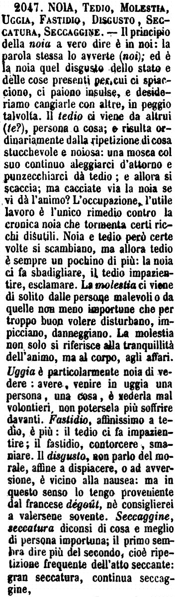 | Noia, Tedio, Molestia, Uggia, Fastidio, Disgusto, Seccatura, Seccaggine - Il principio della noia a vero dire è in noi: la parola stessa lo avverte (noi); ed è la noia quel disgusto dello stato e delle cose presenti per cui ci spiacciono, ci paiono insulse, e desideriamo cangiarle con altre, in peggio talvolta. Il tedio ci viene da altrui (te?), persona o cosa; e risulta ordinariamente dalla ripetizione di cosa stucchevole e noiosa: una mosca col suo continuo aleggiarci d'attorno e punzecchiarci dà tedio; e allora si scaccia; ma cacciate via la noia se vi dà l'animo? L'occupazione, l'utile lavoro è l'unico rimedio contro la cronica noia che tormenta certi ricchi disutili. Noia e tedio però certe volte si scambiano, ma allora tedio è sempre un pochino di più: la noia ci fa sbadigliare, il tedio impazientire, esclamare. La molestia ci viene di solito dalle persone malevoli o da quelle non meno importune che per per troppo buon volere disturbano, impicciano, danneggiano. La molestia non solo si riferisce alla tranquillità dell'animo, ma al corpo, agli affari. Uggia è particolarmente noia di vedere: avere, venire in uggia una persona, una cosa, è vederla mal volontieri, non potersela più soffrire davanti. Fastidio, affinissimo a tedio, è più: il tedio ci fa impazientire; il fastidio, contorcere, smaniare. Il disgusto, non parlo del morale, affine a dispiacere, o ad avversione, è vicino alla nausea: ma in questo senso lo tengo proveniente dal francese dégoût, nè consiglierei a valersene sovente. Seccaggine, seccatura diconsi di cosa e meglio di persona importuna; il primo sembra dire più del secondo, cioè ripetizione frequente dell'atto seccante: gran seccatura, continua seccaggine, [immagine] |