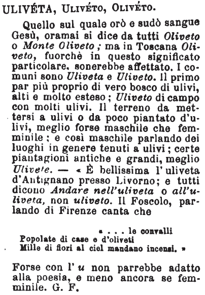 | Uliveta, Uliveto, Oliveto - Quello sul quale orò e sudò sangue Gesù, oramai si dice da tutti Oliveto o Monte Oliveto; ma in Toscana Oliveto, fuorché in questo significato particolare, sonerebbe affettato. I comuni sono Uliveta e Uliveto. Il primo par più proprio di vero bosco di ulivi, alti e molto esteso; Uliveto di campo con molti ulivi. Il terreno da mettersi a ulivi o da poco piantato d'ulivi, meglio forse maschile che femminile; e così maschile parlando dei luoghi in genere tenuti a ulivi; certe piantagioni antiche e grandi, meglio Ulivete. - «E' bellissima l'uliveta d'Antignano presso Livorno; e tutti dicono Andare nell'uliveta o all'uliveta, non uliveto. Il Foscolo, parlando di Firenze canta che